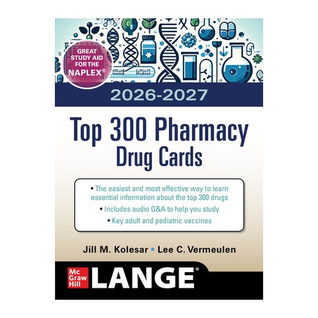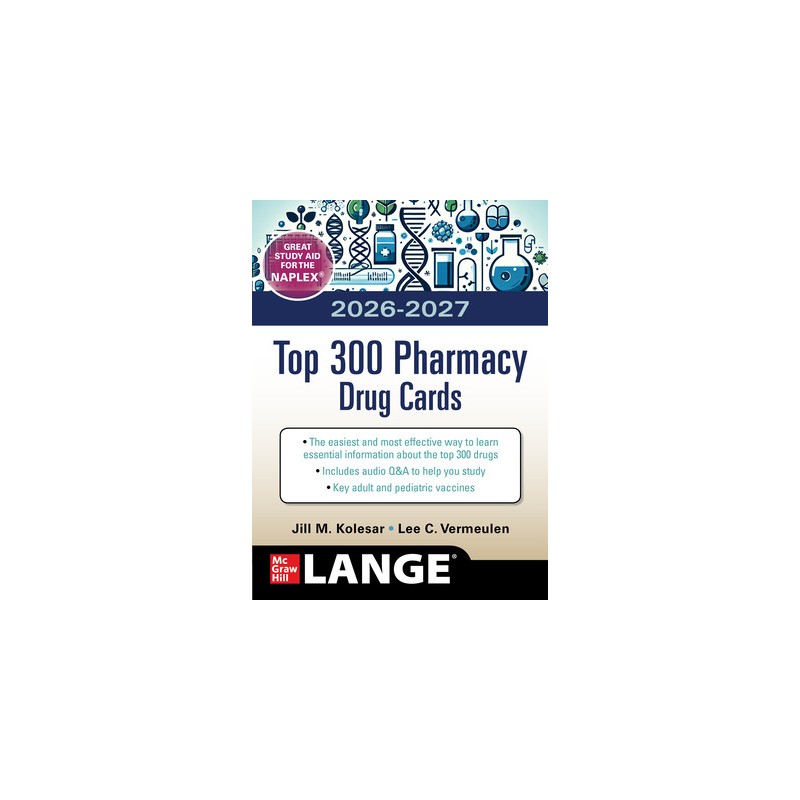 Perfect for NAPLEX™ and course review, McGraw Hills 2026/2027 Top 300 Pharmacy Drug Cards is the most concise and up-to-date resource for building a solid knowledge base of the most commonly used drugs. Adverse reactions are organized by common, less common, and rare but serious to help users organize thoughts for counseling patients. This updated edition includes 30 new cards.