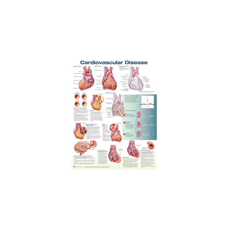 Cardiovascular Disease, Third Edition is a useful chart featuring artwork from Anatomical Chart Company that presents normal heart anatomy and various cardiovascular diseases. All illustrations are labeled, and diseases are textually explained.