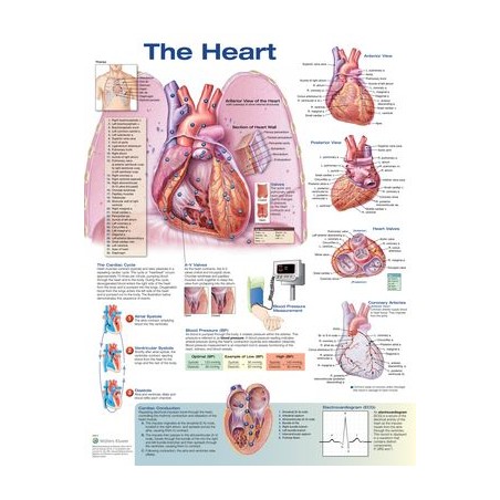 One of Anatomical Chart Companys most popular charts, The Heart, Second Edition features a large central image that shows the heart sitting on the diaphragm with the suggestion of the lungs and ribs behind it. Cutaways on the anterior wall of the heart show the interior structures, and additional images present normal anatomy, the cardiac cycle, blood pressure measurement, cardiac conduction, and more. All features are clearly labeled.