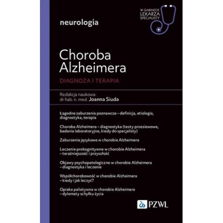Publikacja dotycząca diagnostyki, leczenia i rehabilitacji pacjenta podczas przebiegu choroby Alzheimera, przygotowana z wybitnymi specjalistami neurologii i rehabilitacji neurologicznej. Porusza tematykę szczegółowej opieki nad pacjentem z chorobą Alzheimera, zaburzeń poznawczych, prokognitywnych, możliwych objawów psychopatologicznych czy zaburzeń językowych. Przekazuje też wiedzę o możliwościach leczenia i rehabilitacji, jak również opieki nad pacjentem w terminalnym stadium choroby. Publikacja została oparta na aktualnym piśmiennictwie oraz wiedzy i doświadczeniu z praktyki Autorów. To użyteczne i praktyczne narzędzie do pogłębienia i zaktualizowania wiedzy na temat schorzeń neurologicznych u pacjenta dorosłego dla lekarzy neurologów, studentów medycyny, jak i innych specjalizacji lekarskich i zawodów medycznych, udzielających pomocy pacjentom cierpiącym na choroby neurodegeneracyjnych.