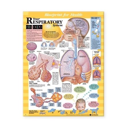 Your Respiratory System (from the Blueprint for Health charts series) is an ideal tool for educating pediatric patients and school aged kids. This chart describes why we breathe and illustrates the respiratory system and the role of important organs such as the brain, nose, trachea, lungs, heart, and diaphragm. It shows what happens inside the lungs and the flow of air during the breathing process and shows smoke-damaged alveoli. The chart includes fun facts (You take over 20,000 breaths a day!), how to make a model of your lungs, and answers to questions like Why do I yawn? and How do I laugh? Bright colors, bold figures, and appealing, anatomically correct illustrations make learning enjoyable.