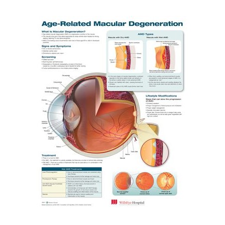 Age-Related Macular Degeneration is a highly detailed illustrated chart that is easy to understand and perfect for patient education. This chart helps you to explain what macular degeneration is, its effects on vision and treatment options.